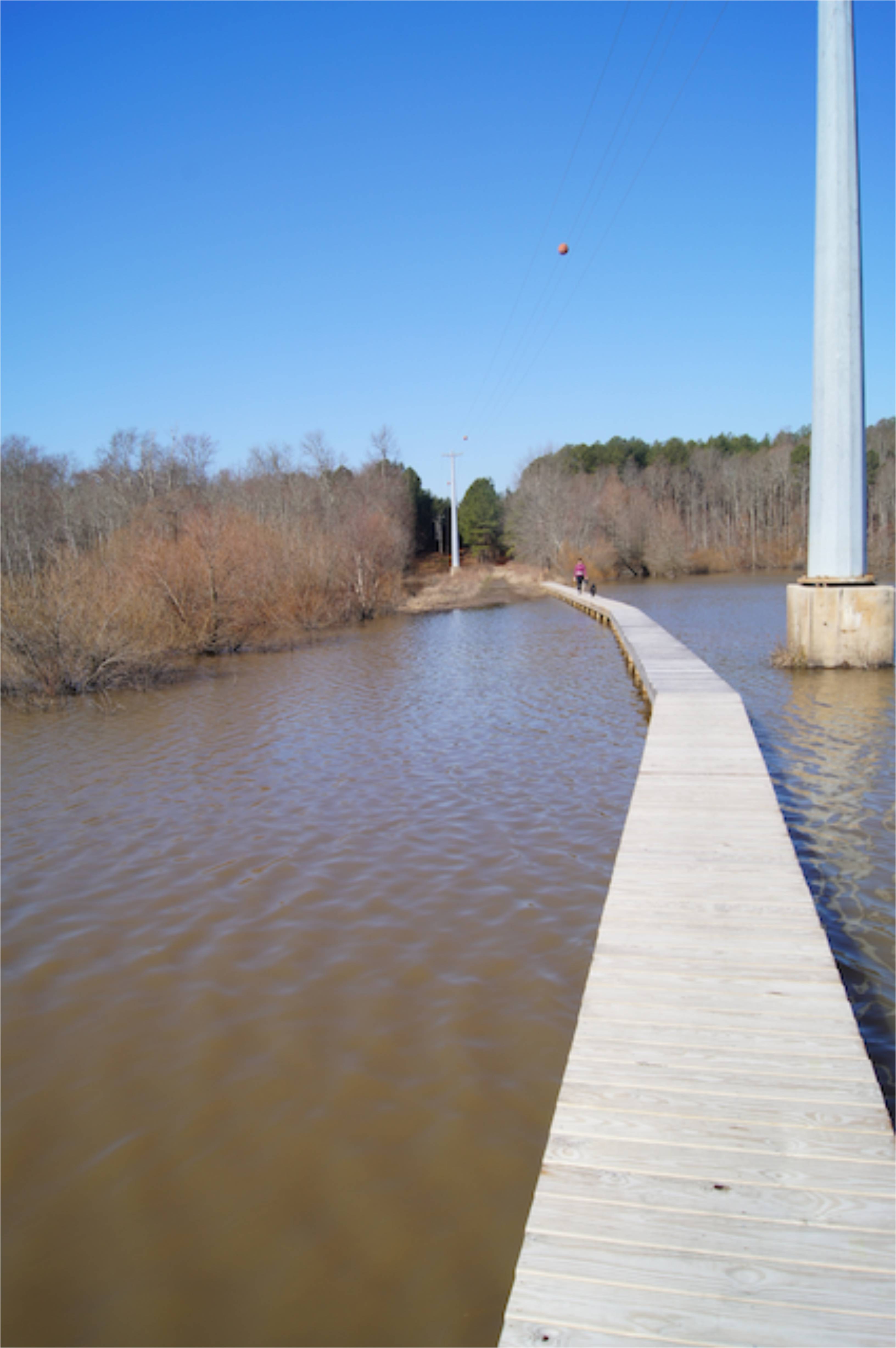 Technically, this section begins in the middle of the Little Lick Creek bridge, but since there’s no parking at the bridge — which, combined with 100 yards of lead-up boardwalk, spans not just Little Lick Creek, but a wetland that is often submerged — you begin at roadside parking at the elbow of Jimmy Rogers Road, west of the bridge. You must backtrack a quarter mile or so to get to the bridge, but it’s worth it, for here you’ll find a rarity on the Piedmont portion of the MST. Gregory Scott, the Friends of the Mountains-to-Sea Trail volunteer who oversees maintenance of Section 15, explains.
