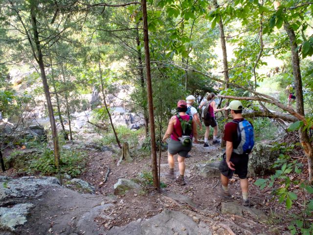 After passing beneath Cole Mill Road, the trail passes through a flood plain, then encounters a number of short, steep climbs in and out of coves, offering suggestions of the southern Appalachians. The trail enters another floodplain, followed by a steady climb into the Cabe Lands Access area.