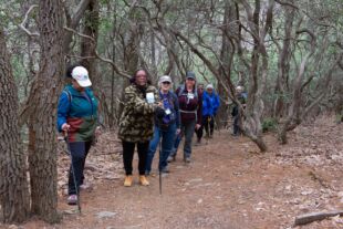 About a mile into the hike, the rain began to sprinkle, but it did not last long. As we hiked through the trail, we briefly stopped to view the budding plants shooting through the earth and the beautiful flowers giving us the first showing of spring. Climbing steep inclines and stairs, this hike was proving to be more than moderate, but we stopped as often as we needed to gather ourselves, have a drink of water and take a few deep breaths. The hiking leaders were patient with us, a group of 12, most of us meeting for the very first time. Even with the threat of inclement weather, there were other hikers on the trail as well. We all seemed to be moving at a pretty steady pace, trying to avoid the sleet and snow predicted for later in the day.