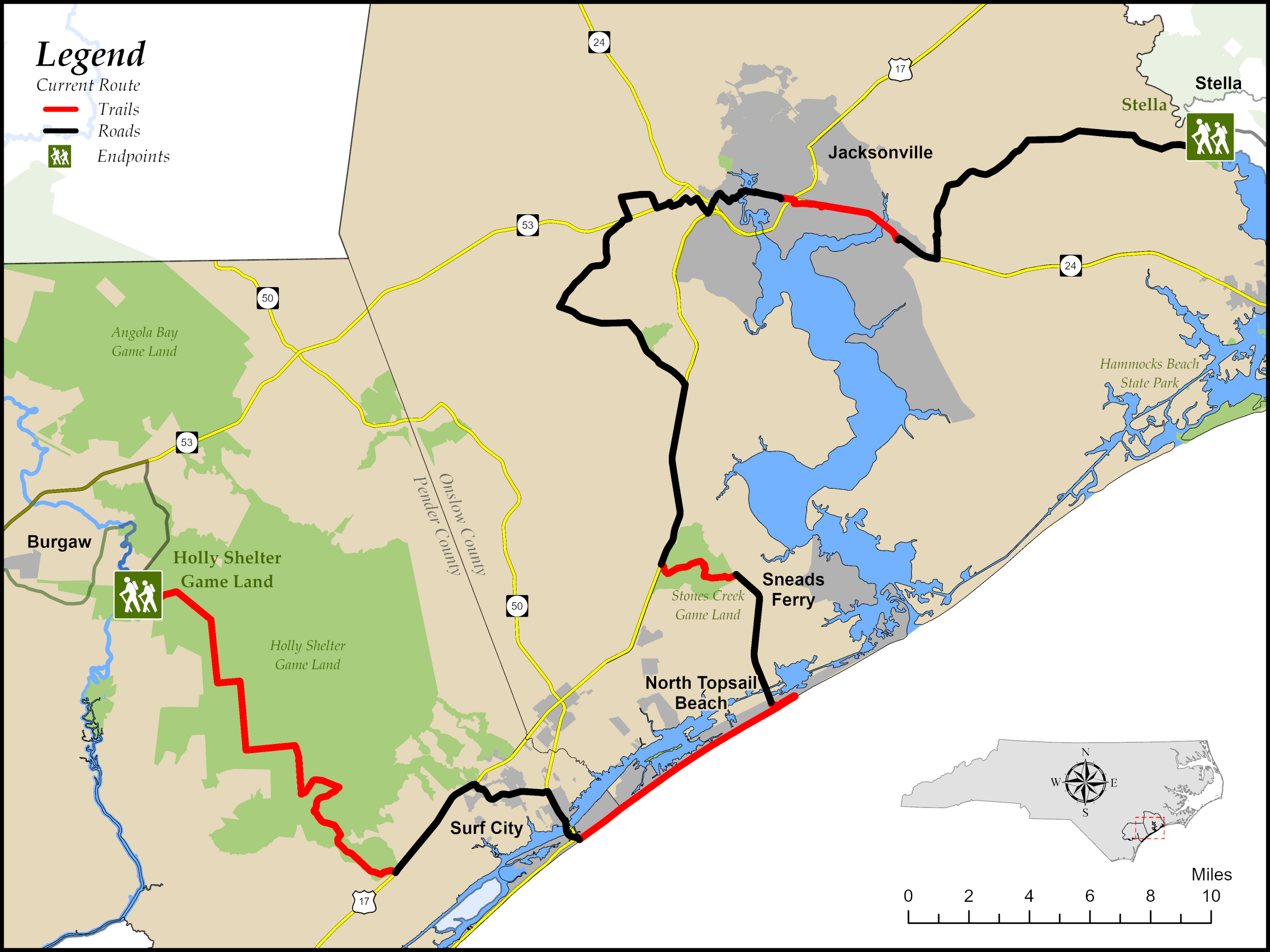 Camp Lejeune Marine Corps Base and the city of Jacksonville lie in the center of this segment. Much of the MST route from Sneads Ferry through Jacksonville follows roads that skirt the massive base. Hikers will see plenty of signs of the military presence—from people in uniform, to military vehicles, to signs along the highway.