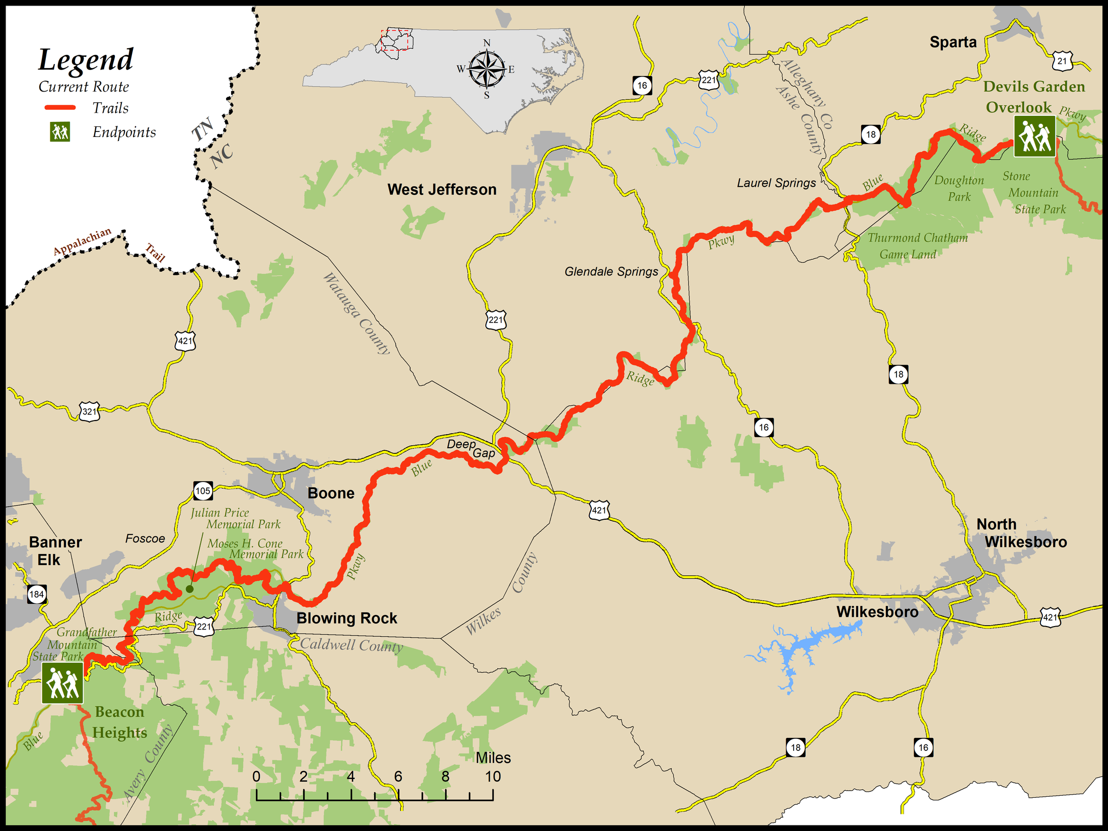 - Moses H. Cone Memorial Park, where the MST uses the park’s former carriage trails and passes by Flat Top Manor, which now serves as the parkway’s craft center