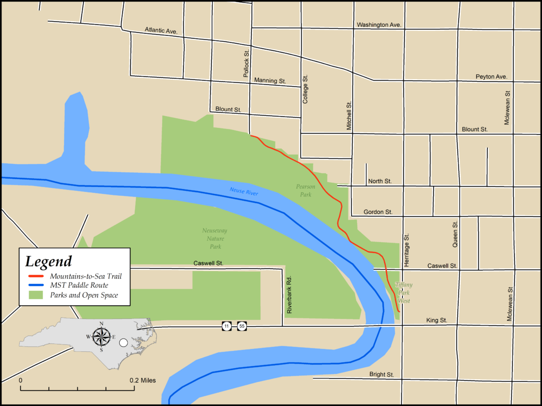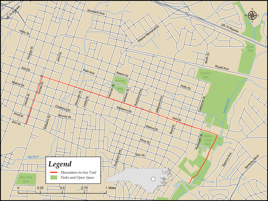 The 3.3 miles of designated MST route in Goldsboro include Center St. through downtown, a connection along Ash St., one of the city’s major thoroughfares, and the paved Stoney Creek Greenway.