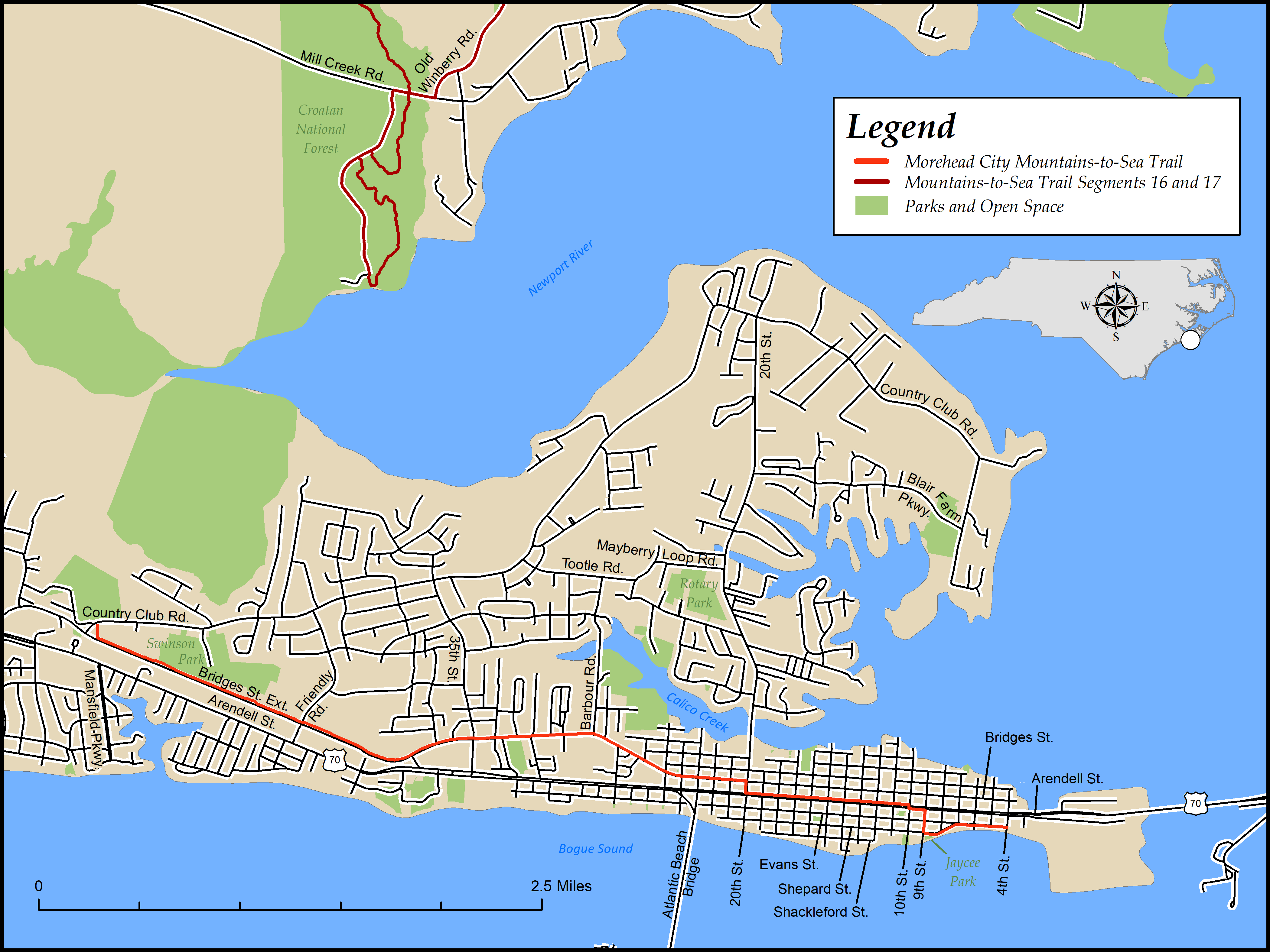 In several locations across the state, additional trail has officially been designated as part of the MST. Three are located in cities along the Neuse River corridor, which is the original planned route of the MST and is approximated by the Neuse River Paddle Route (Segments 11A-16A). A fourth section is in Morehead City.