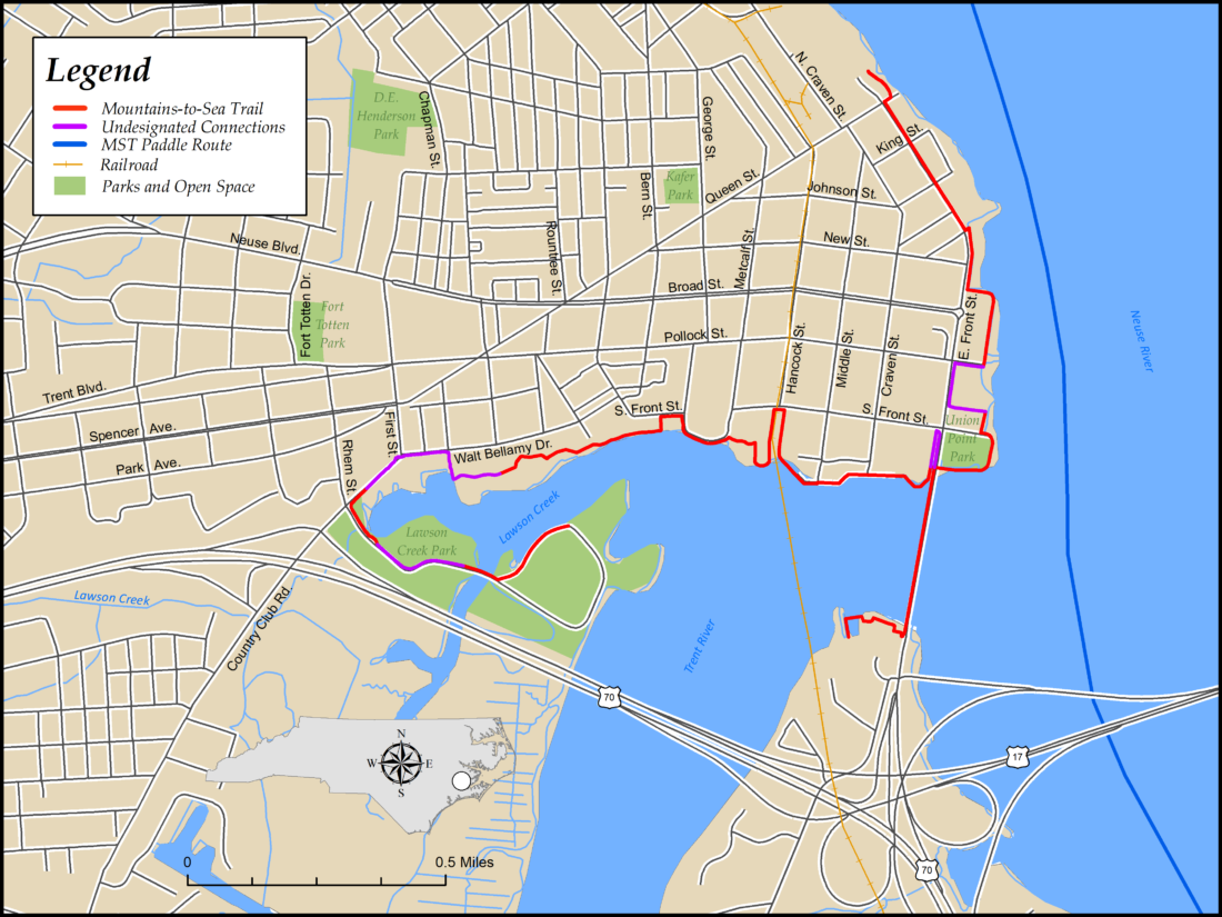 The former colonial capital of North Carolina has 3.1 miles of multi-use path designated as part of the MST. There are gaps in the designated trail, so an additional 0.9 mile of connectors, all on multi-use path and sidewalks, brings the total distance to 4.0 miles. The path skirts downtown and the Neuse and Trent riverfronts, passing several historic and scenic locations.