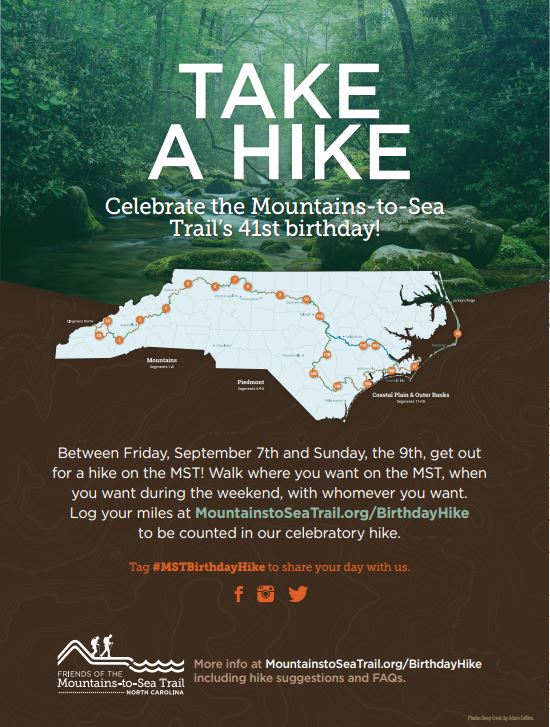 Between Friday, September 7th and Sunday the 9th get out for a hike on the MST! Help us collectively accumulate a huge number of miles walking on the MST across North Carolina in celebration of this beautiful trail