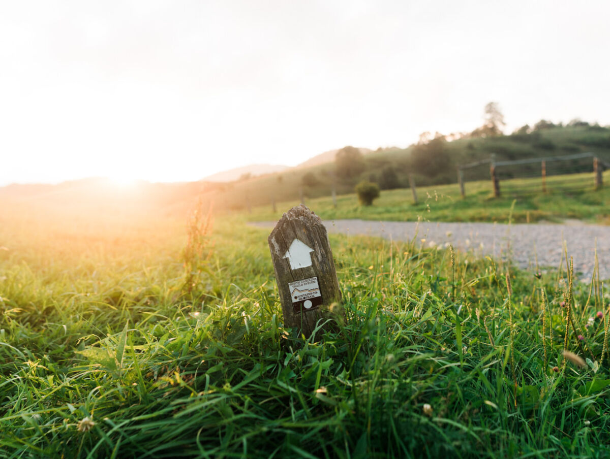 Glancing at my watch I realize that I need to quicken my pace if I hope to catch the sunset at the meadow near the tunnel. I stop long enough to admire the Turks Cap Lily that is growing beside the trail. It is as tall as I am! Beyond it is a fence and the meadow with a few cows grazing. The trees give way and I soon reach the right turn to go through the tunnel beneath the Blue Ridge Parkway and on towards Cone Manor. Instead of turning right, though, I turn left and walk 40 yards up the hill (Pro Tip: if you ever do this hike make sure you take the time to walk up the hill- you won’t be disappointed!). As I clear the treeline below, I’m pleased to see that the clouds have lifted off of Grandfather Mountain. And, I am just in time to catch the sunset! The view is spectacular- open meadows, rolling hills, and my old friend- Grandfather Mountain standing proud on the horizon. It has been seven years since I’ve hiked this stretch of the Mountains-to-Sea Trail and it is just as I remembered- Perfect.